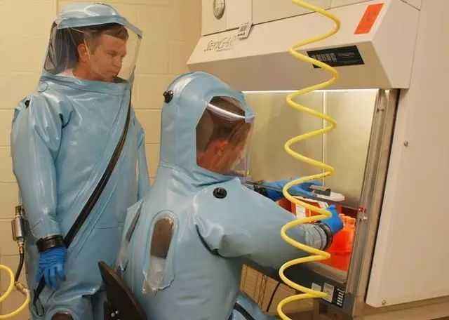 P4實(shí)驗(yàn)室的設(shè)計不盡相同,典型的P4實(shí)驗(yàn)室由更衣區(qū)、過濾區(qū)、緩沖區(qū)、消毒區(qū)、核心區(qū)組成。在實(shí)驗(yàn)室的四周裝有高效空氣過濾器。到達(dá)實(shí)驗(yàn)室的核心區(qū),總共有10道門,最里面的7道門是互鎖的,也就是說,如果一道門沒有關(guān)好,另一道門肯定打不開,這樣避免空氣的流通。更衣區(qū)依次為外更衣室、淋浴室和內(nèi)更衣室。消毒區(qū)為化學(xué)淋浴室,工作人員離開主實(shí)驗(yàn)室時首先經(jīng)過化學(xué)淋浴消毒正壓防護(hù)服表面。核心區(qū)任何相鄰的門之間都有自動連鎖裝置,防止兩個相鄰的門被同時打開。對于不能從更衣室攜帶進(jìn)出主實(shí)驗(yàn)室的材料、物品和器材,應(yīng)在主實(shí)驗(yàn)室墻上設(shè)置具有雙門結(jié)構(gòu)的高壓滅菌鍋、浸泡消毒槽、熏蒸室或帶有消毒裝置的通風(fēng)傳遞窗,以便進(jìn)行傳遞或消毒。核心區(qū)里配有生物安全柜、超低溫冰箱、離心機(jī)、電熱細(xì)胞培養(yǎng)柜、顯微鏡和實(shí)驗(yàn)臺、小型動物實(shí)驗(yàn)室等。生物安全柜頂上有一個直徑0.5米左右的粗管子,直接通到房頂,它也是負(fù)壓狀態(tài)的,一些主要的操作都需要在生物安全柜中進(jìn)行。